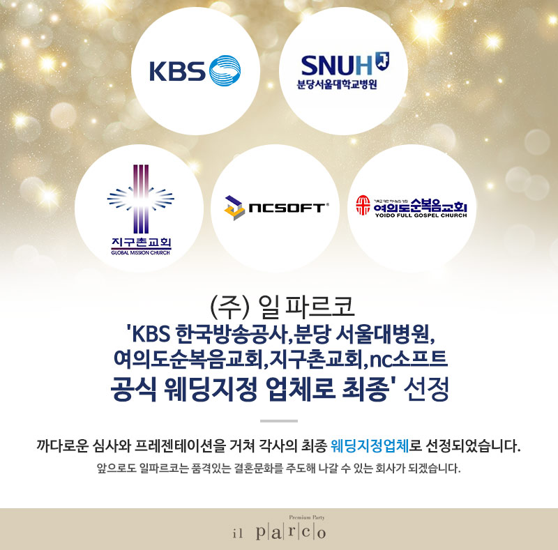 'KBS 한국방송공사,분당 서울대병원, 여의도순복음교회,지구촌교회,nc소프트 공식 웨딩지정 업체로 최종' 선정